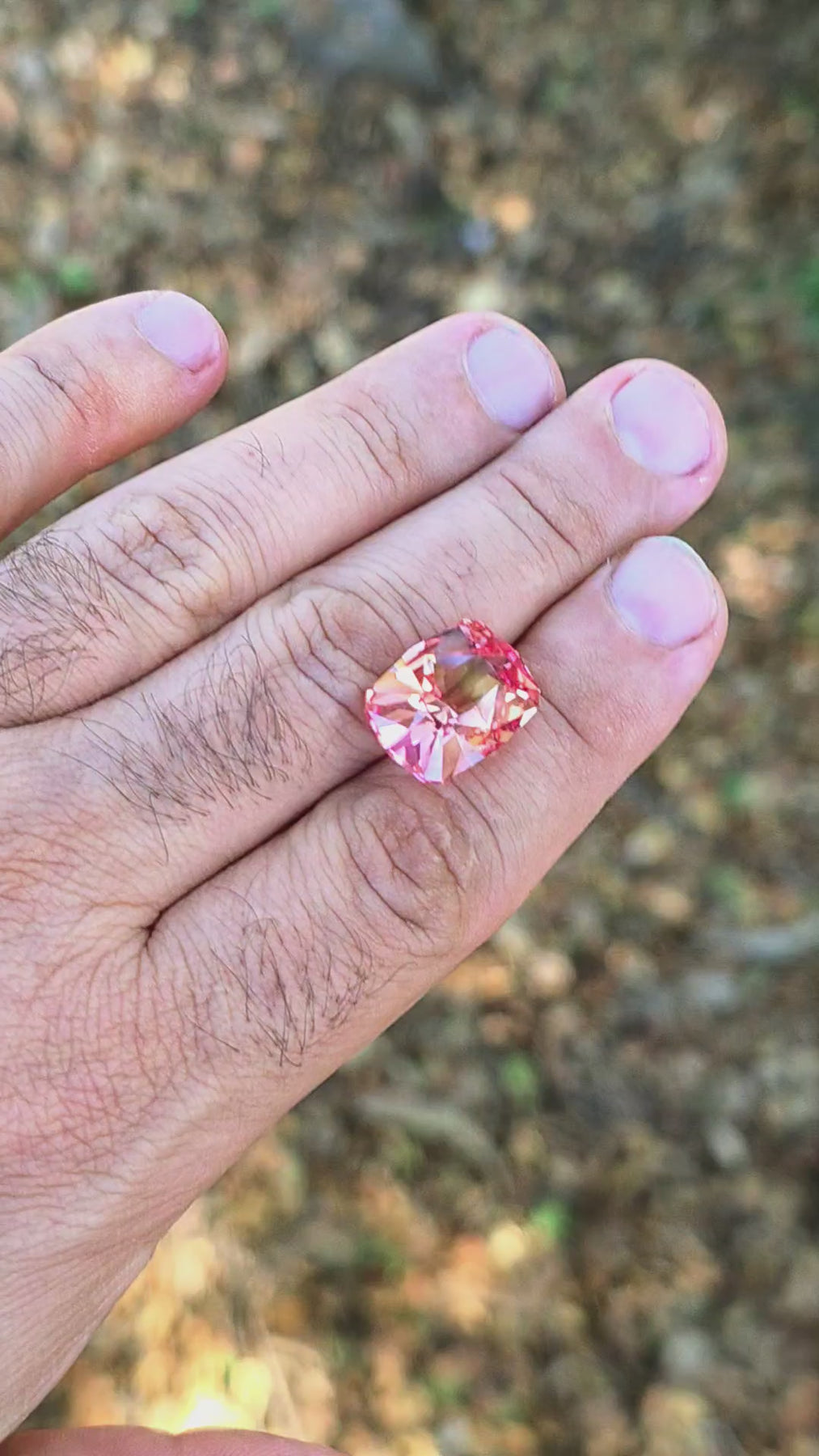 🔥💎✨ (Our absolute favorite Pad colored lab sapphire. We only have enough material to cut a piece every few months). A 19.77-carat Cushion Internal Reflections gem cut from older crystals produced by the historic Djeva factory (closed in 2021), this corundum piece offers vivid color and lively red fluorescence that shifts beautifully under different lighting. Its corundum composition provides excellent hardness and robustness, making it highly suitable for daily-wear settings like rings, bracelets, and secure pendants. The cushion internal reflections cut maximizes internal fire while preserving structural integrity for long-lasting jewelry enjoyment.