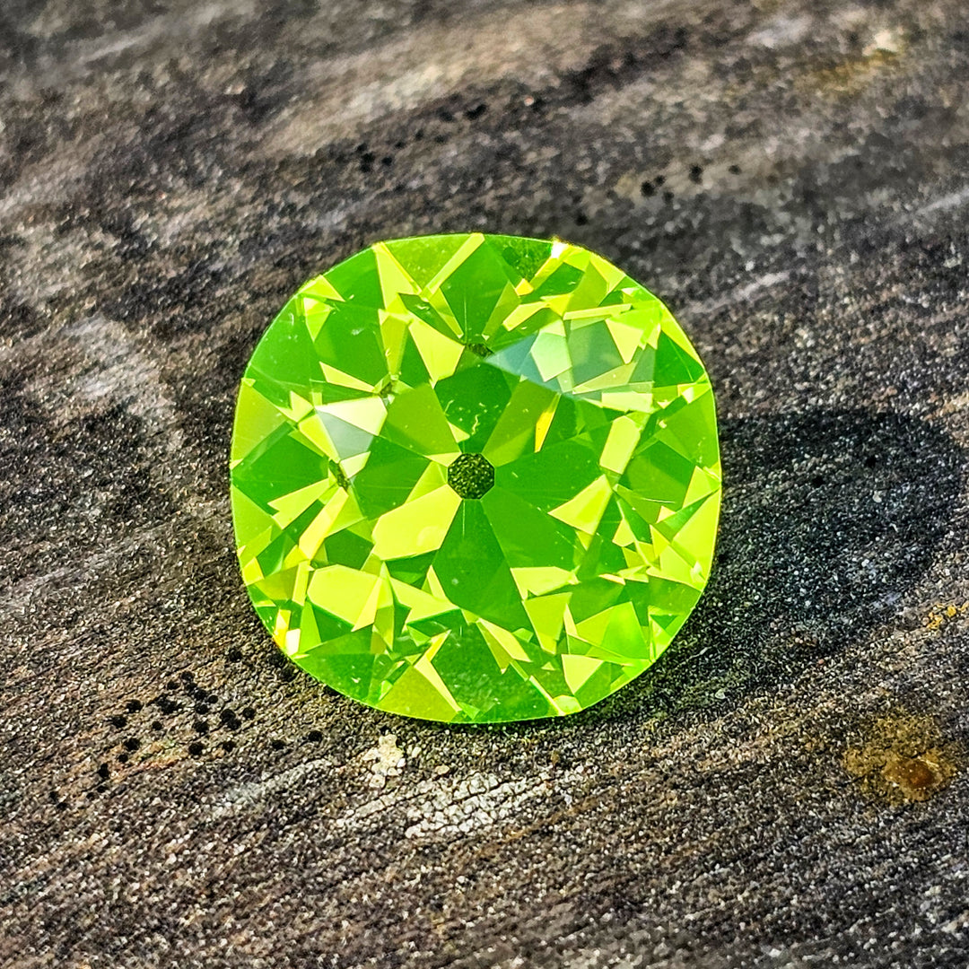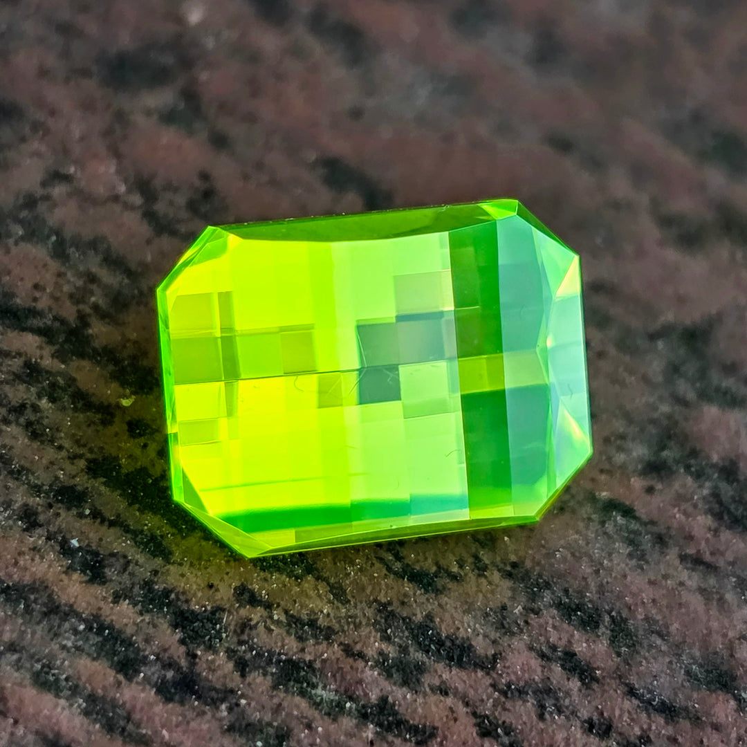 Ce:LuAG: Cerium doped LuAG (Lutetium aluminium garnet) is a hyperfluorescent green garnet. It is so fluorescent it will emit a glowing green color under almost any lighting condition. In sunlight it will emit a strong green glow, as well as under blacklight. It has a mohs hardness of 8.5.