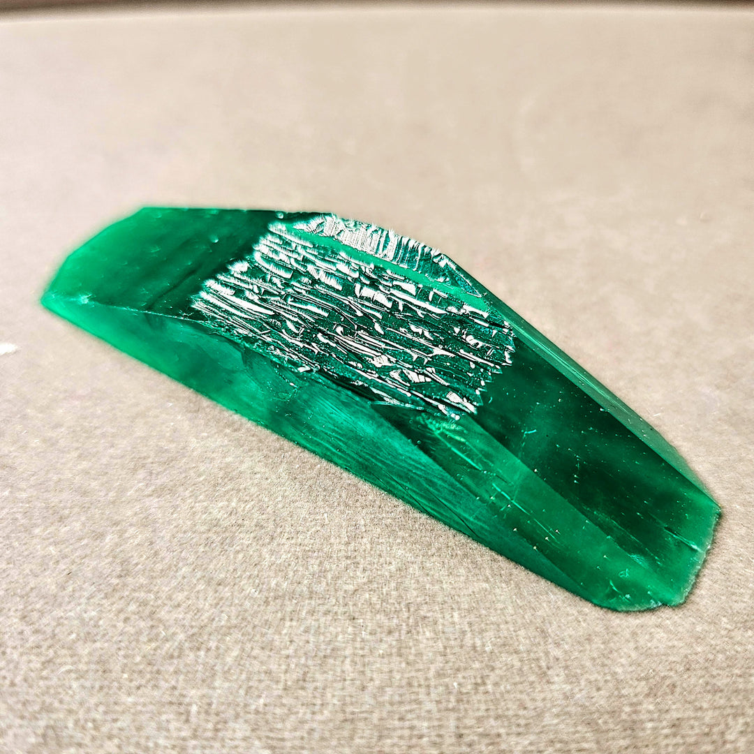The "Colombian" color hydrothermal lab-created emerald is renowned for its vividly brilliant coloration among synthetic gemstones. It demonstrates dichroism, displaying a rich grass-green color along the C axis and a striking teal along the A axis. These axes merge seamlessly to produce a gemstone with a dazzling green-blue glow. Crafting this material is particularly expensive because the autoclaves must be lined with gold or platinum to shield against the acidic solution's corrosive effects during the growth process.