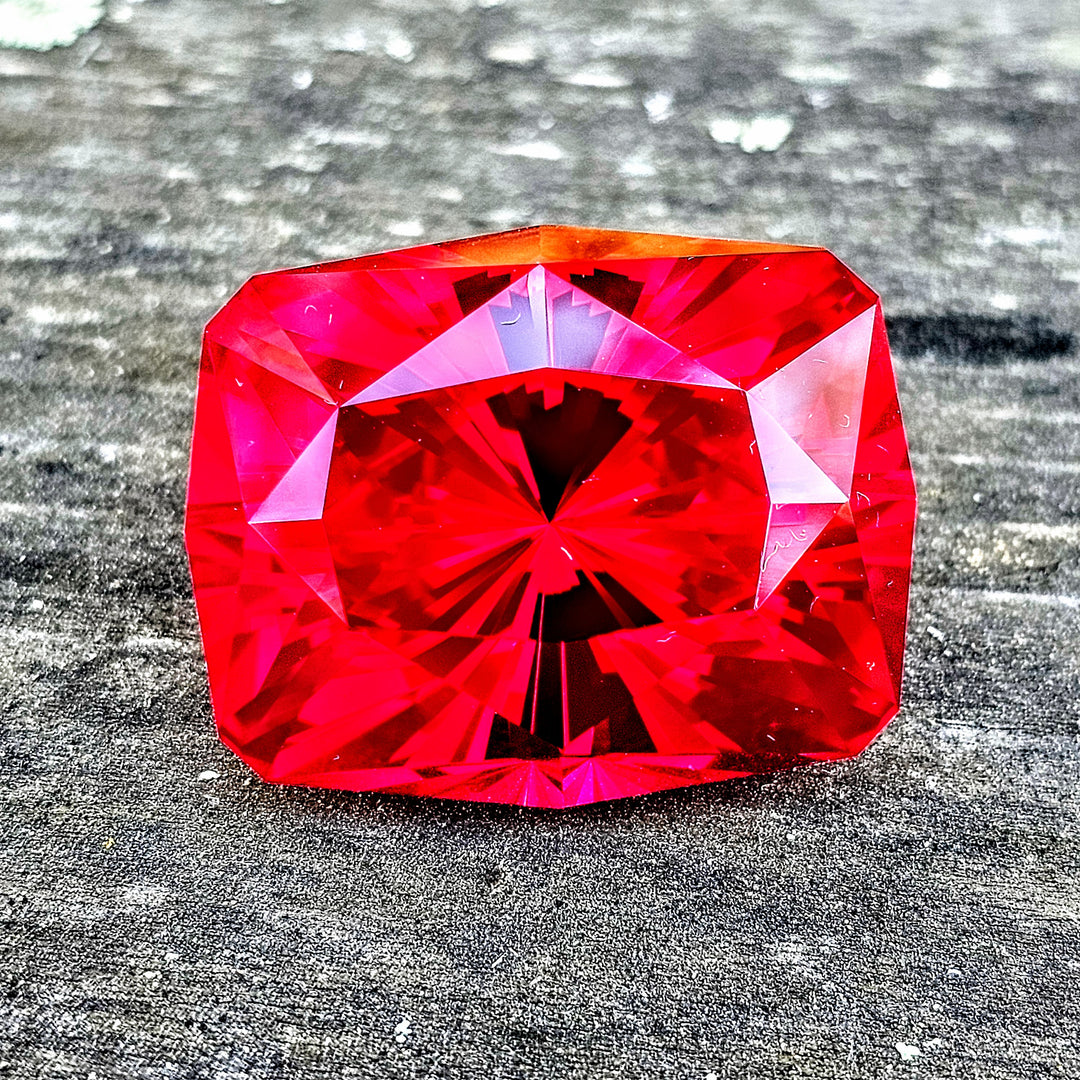 This material comes with a fascinating backstory. Remarkably large Kyropoulos ruby crystals, intended for use in fiber optics, were successfully cultivated. It was a revelation to discover that rubies doped with chromium using the Kyropoulos method existed, a fact we were unaware of until recent reports surfaced. However, these crystal boules exhibited cracks and bubbles, leaving us to speculate whether these were the results of experimental efforts or flawed growth processes, thus casting doubt on the viability of future production. Interestingly, this type of ruby demonstrates a range of hues—from neon red/pink to deeper reds, similar to those hues found in Djeva Ruby (grades 3, 4, and 5). In our view, these rubies exhibit the ideal coloration, marked by vibrant tones without any loss of intensity and extinction.